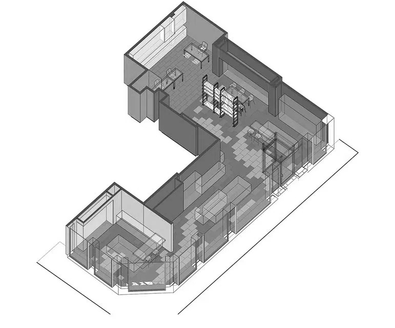 The program of the premises is divided into: differentiated spaces dedicated to each of the collections / Office area with three work tables / Meeting space with the client where to discuss the reform projects, exhibit samples of materials and make presentations.