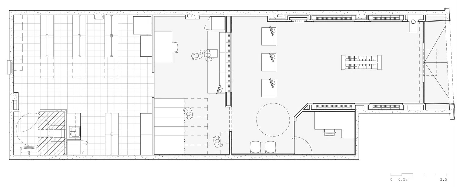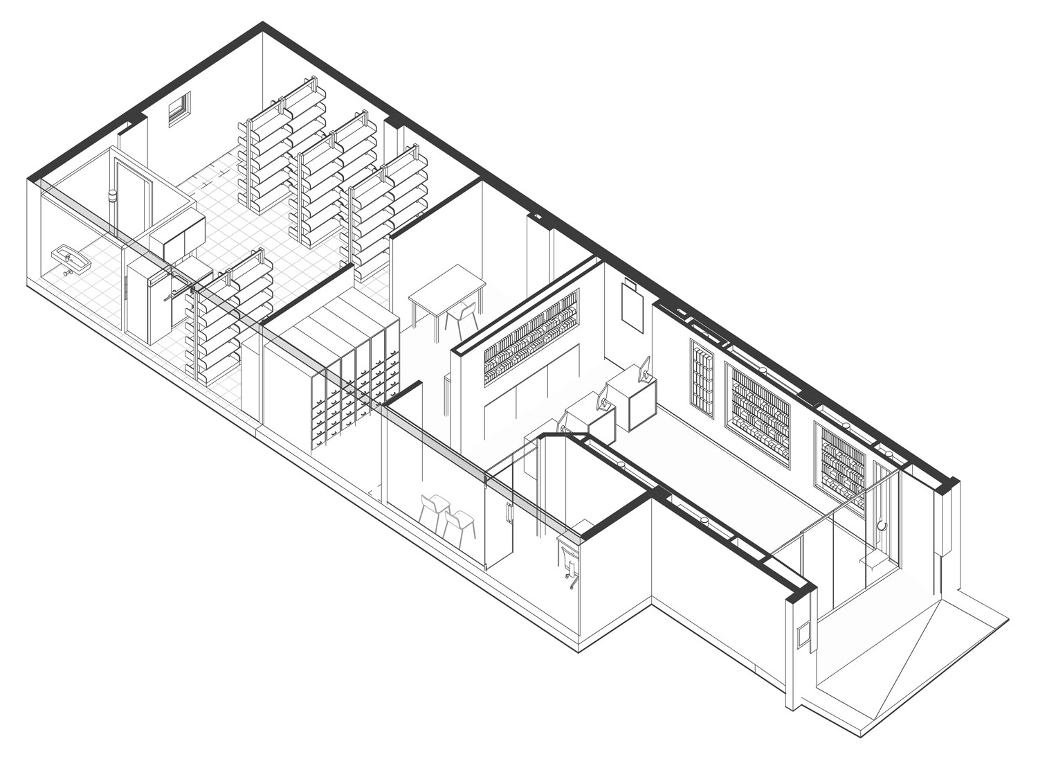 In the back of house, which are the guts of the premises and where their proper functioning is managed, we have the order classification table connected to the counters, the drawers, and a work station for the staff. At the bottom of the premises is the warehouse, a small office and the accesible toilet.