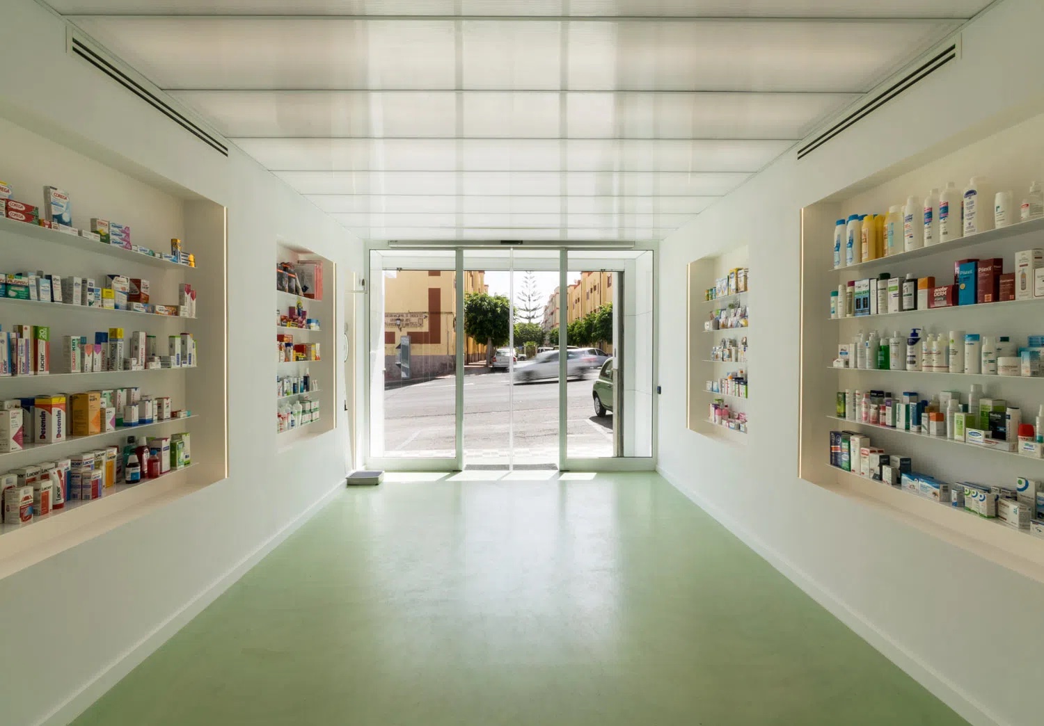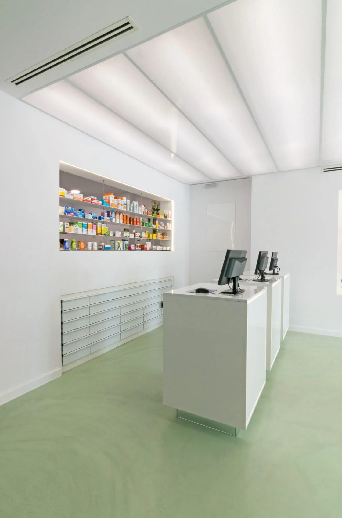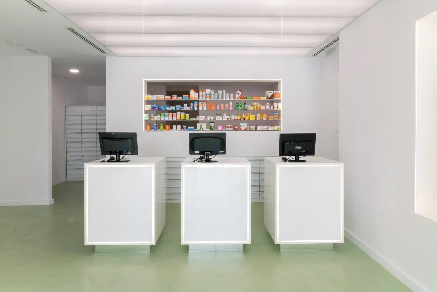 For the reconfiguration of the new premises for the pharmacy, the aim is to achieve a serene and fresh atmosphere. We are in a town pharmacy, where the main income comes from the sale of prescription drugs.